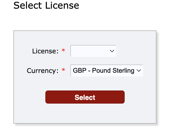 To select a license, navigate to to “My recent roles”→ “License manager” Then choose the desired license and currency using the drop-down menus.